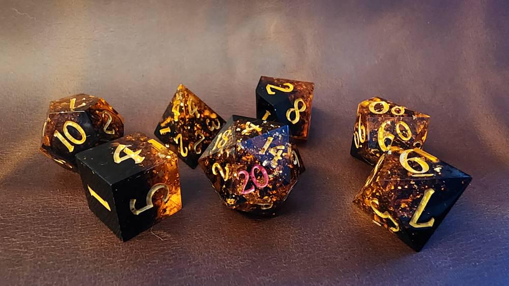 This handmade sharp-edged resin dice set is perfect for tabletop gaming, offering precision and durability for your D&D and other TTRPG adventures. Each set is carefully handcrafted to enhance your gaming experience, making it a must-have addition to any dice collection. Deep Magma is a clear orange with black smoke and gold foil, the encrusted magma from down below.