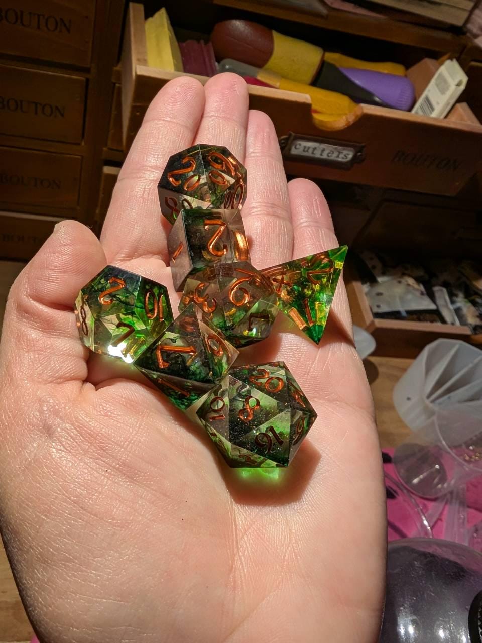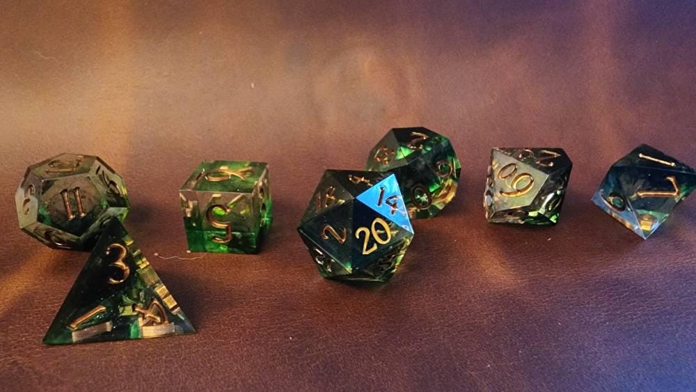 Elevate your tabletop gaming with stunning and beautiful handmade sharp-edged resin dice sets. Whether you play Dungeons & Dragons, Pathfinder, or even OSR RPGs like myself, you can find something here for any character! Message for help, questions, or custom work!
