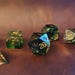 Handmade sharp edge resin dice for Dungeons & Dragons and many other TTRPGs, in a sickly green with black swirling about it.
