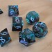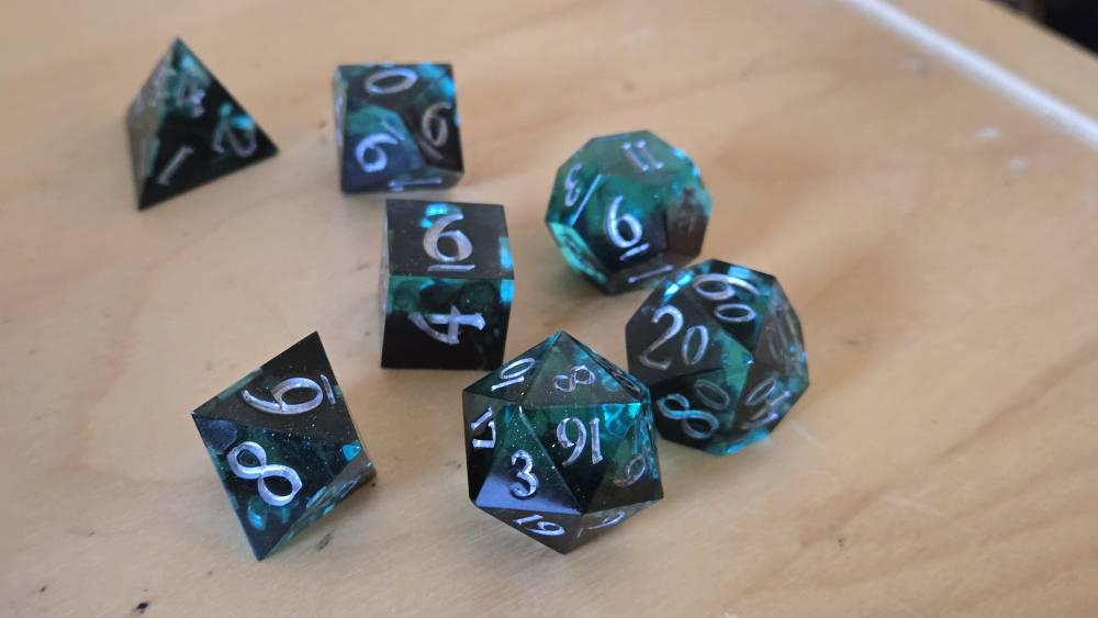 Handmade sharp edge resin dice for Dungeons & Dragons and many other TTRPGs, in a clear teal with black smoke, the lonely voice from the void.