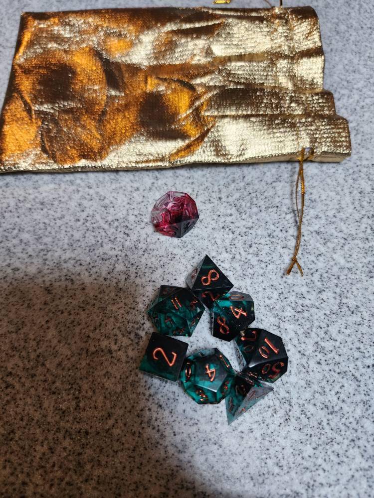 ALL orders include a free bag 🎒! Be aware that style and color of bag may vary, but if you have a specific color you can ask and if I have it in stock I'll set it aside for you! All orders are also for a full 7-piece set or a full 11-piece set, our pricing is not the misleading pricing of other stores who offer a D20 for cheap and then hit you with a huge price hike for a full set! If you want a smaller (or larger) set or just individual dice, feel free to message and ask, we can work with you! We may also send you spares such as B-grade or failed dice, so don't be alarmed if you have extra dice that don't match your ordered set!